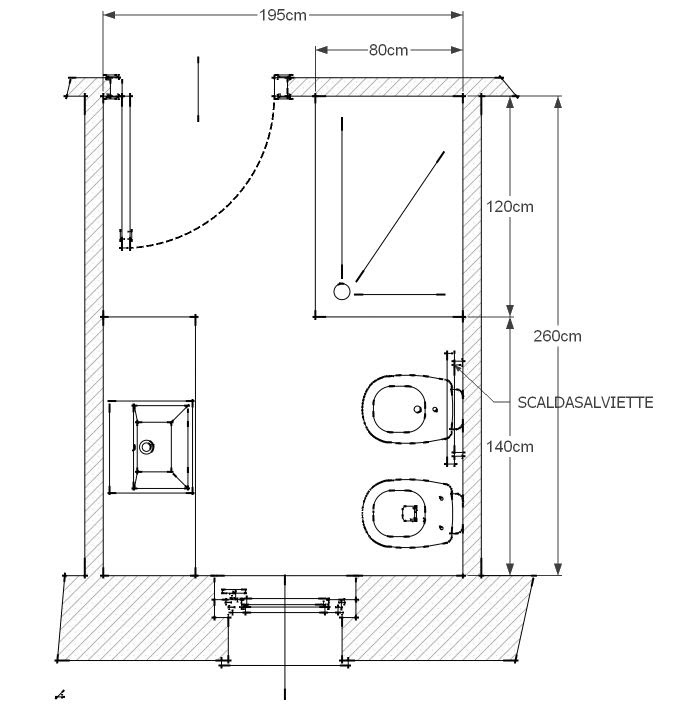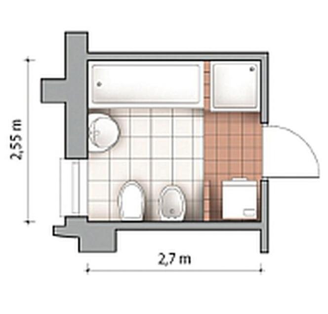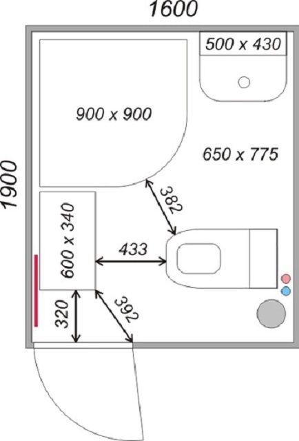 Здесь будет достаточно пространства для установки небольшого шкафчика и стиральной машины. Сантехника расставляется по периметру помещения или по противоположным сторонам. Это зависит от расположения двери. Будет полезен подробный чертеж;