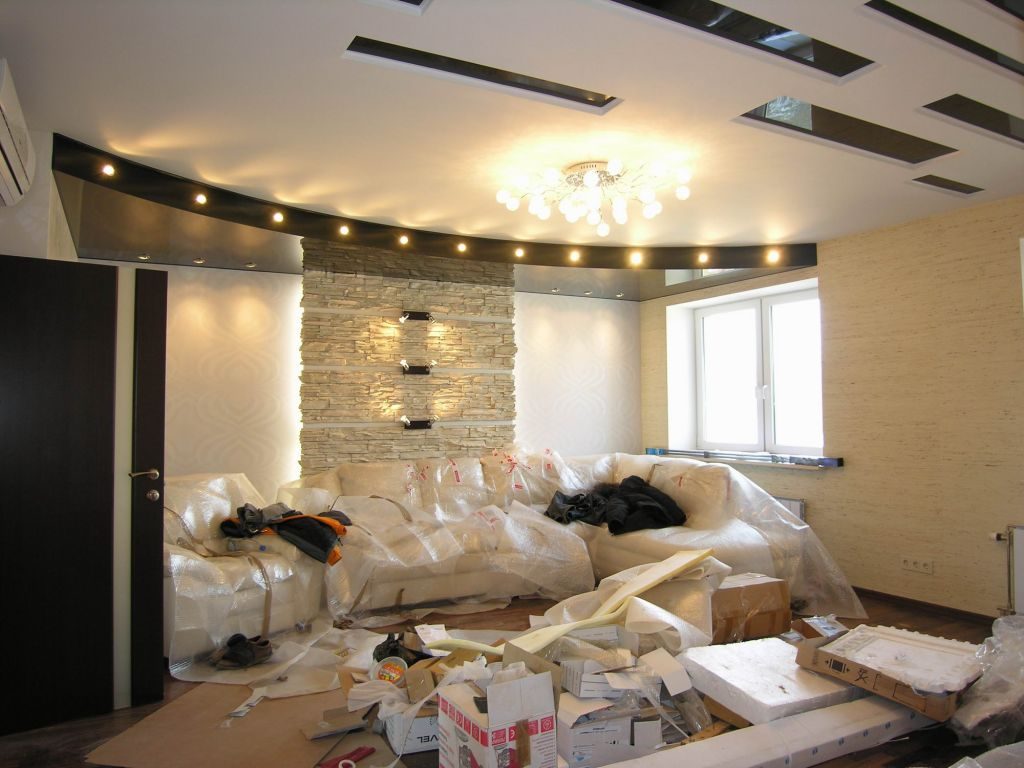 - Косметический ремонт потолка в гостиной – это малобюджетный ремонт, в который могут входить такие процессы, как отделка потолочных и стеновых поверхностей, несущественная замена коммунальных сетей и сантехнического оборудования (канализация и водопровод), а также выполнение замены полового настила.
