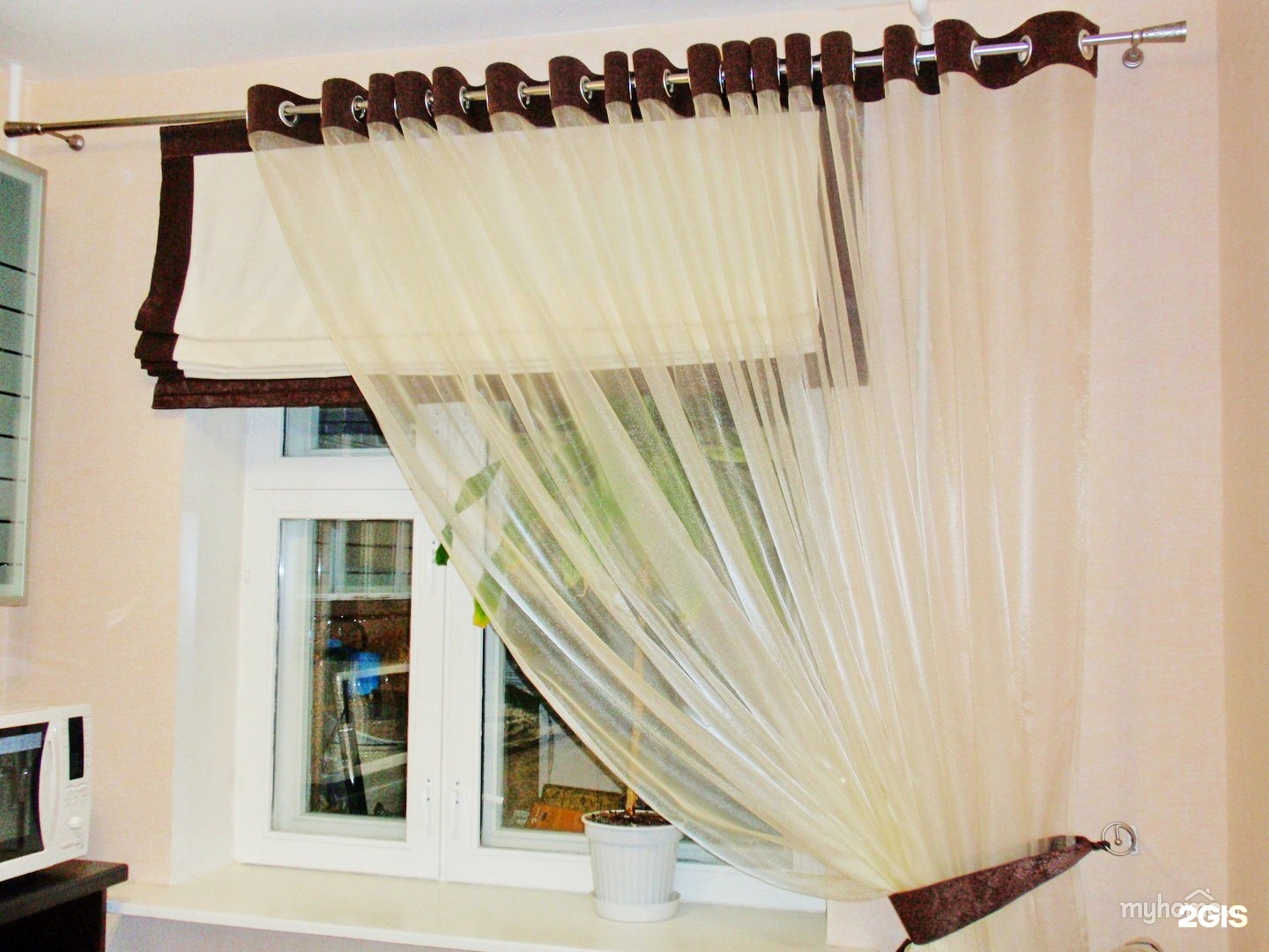 В кухнях небольшой площади лучше отдать предпочтение двум тюлевым полотнам без крупных складок и слоев. . Для свободного доступа к подоконнику часть полотна, которая находится над окном, можно укоротить.
