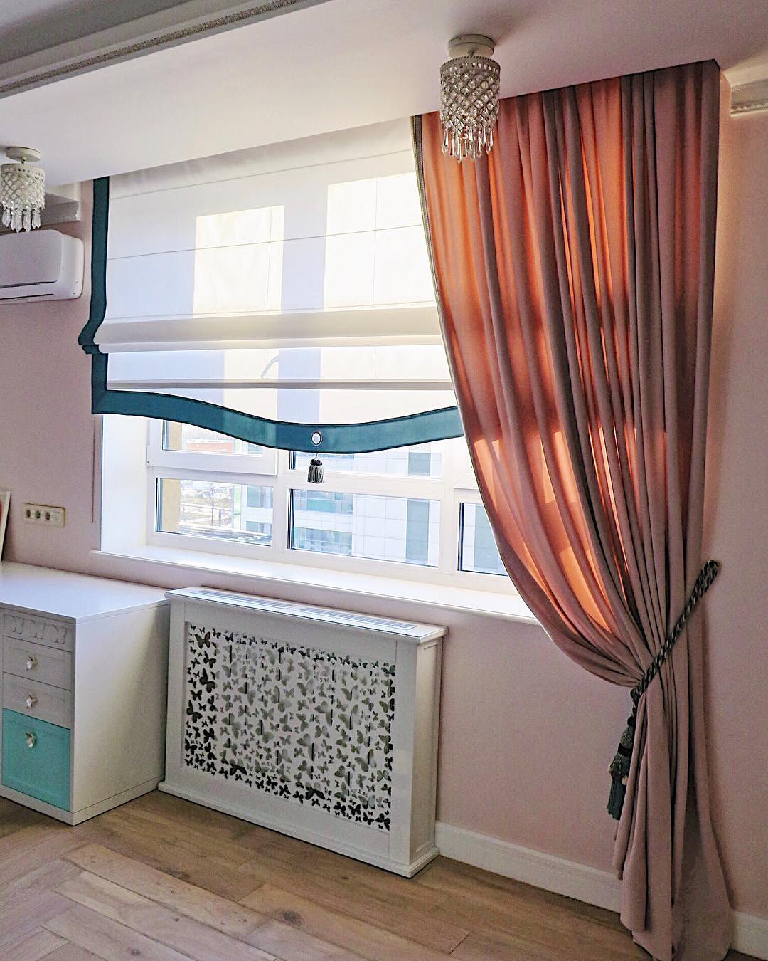 - Можно комбинировать с другим видом оконного текстиля. Если есть желание «укутать» окна сильнее, можно затемнить их сначала римским полотном, а после повесить на карниз портьеры. Но, сегодня многослойность на окнах выходит из моды.