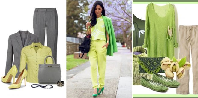 Синие туфельки и зеленая сумочка завершат образ и сделают его приятным для окружающих. Не следует забывать и об украшениях, среди которых могут присутствовать колье и серьги. - Розовый. Дуэт этих двух цветов выглядит очень романтично. Розовое шифоновое платье и туфли следует дополнить ремешком и сумочкой в цвете ядер фисташек. Брюки фисташкового цвета сочетаются с розовым топом, фисташковыми туфлями и бледно-лимонной сумочкой.