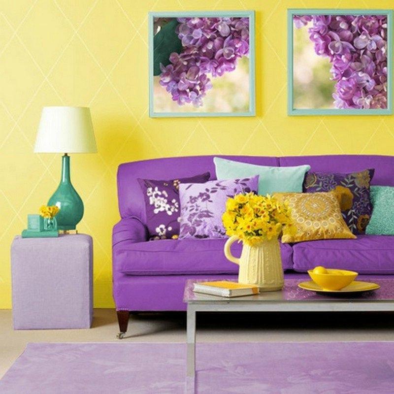 В таких интерьерах присутствует два или три цвета, одним из которых может быть фиолетовый.
