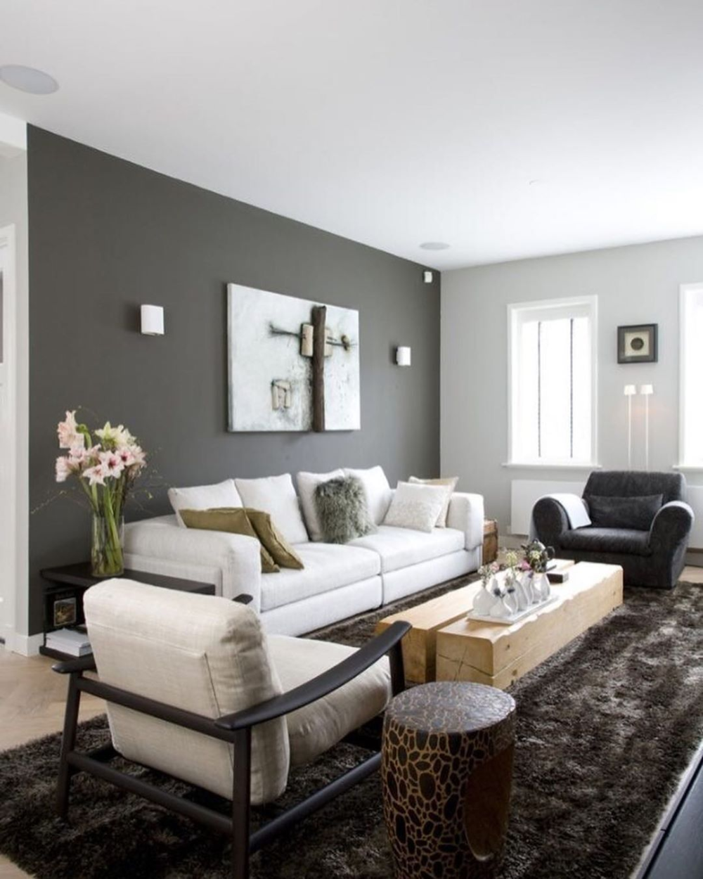 Серо-белая гамма выглядит строго, холодно. Белые акценты и полосы, светлые мебельные фасады и обивка диванов добавляют комнатам объема и высоты, делают интерьер более светлым, изящным. Обычно такое сочетание используют в современных интерьерах, в минималистическом стиле.