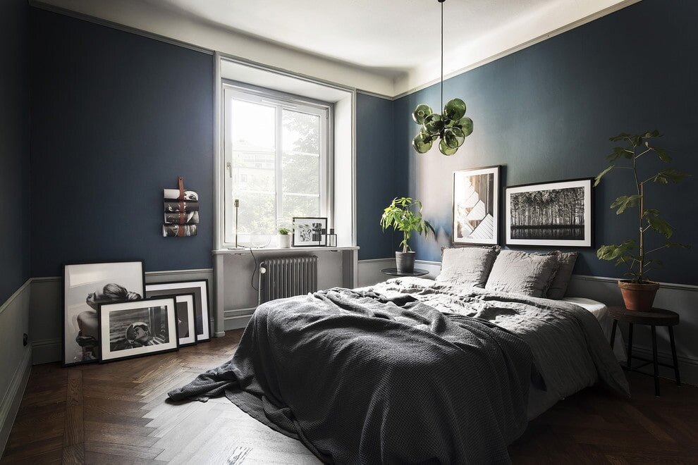 Темные и светлые серые оттенки замечательно смотрятся с насыщенным синим. Можно разбавить композицию серебристыми, белыми, золотыми и желтыми вкраплениями. Такое сочетание идеально для комнат, выходящих окнами на южную сторону, где в течение всего дня царит солнце, и не хватает прохлады.