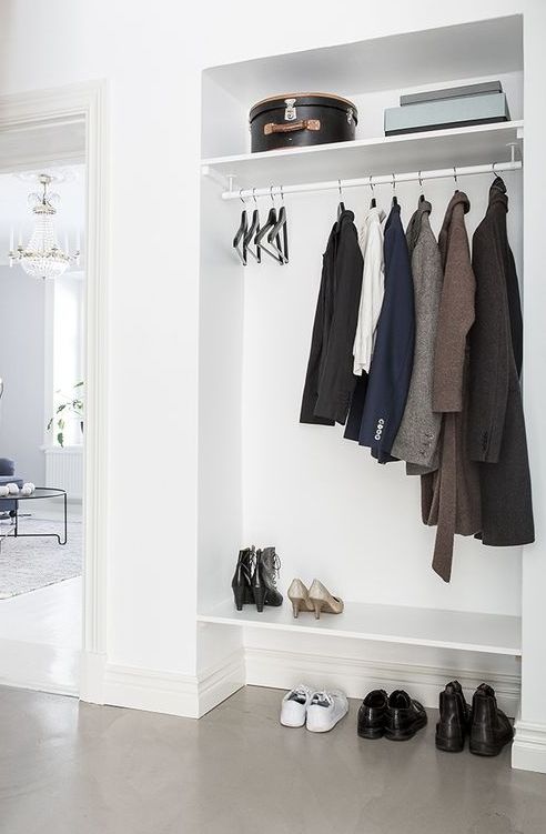 Поэтому чаще всего такую компоновку используют тогда, когда необходимо организовать хранение небольшого количества вещей. Разместить здесь вешалки для хранения большого количества верхней одежды будет уже проблематично.