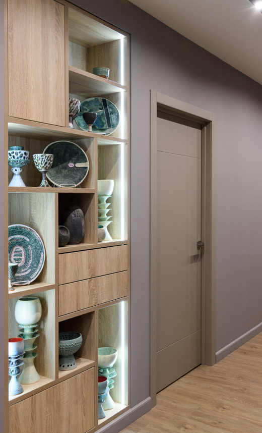 Серый Г-образный шкаф в прихожей современного стиля