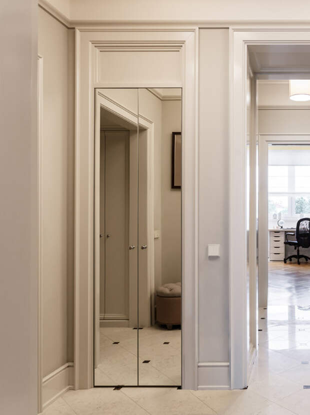 Треугольный шкаф-купе может удачно заполнить угол между дверными проемами