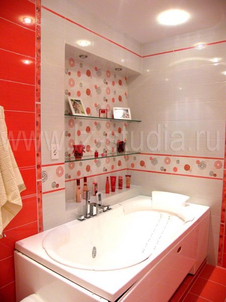 С помощью сочетания белого и яркого алого цвета в отделке стен можно оздать в интерьере небольшой ванной комнаты бодрое и активное настроение