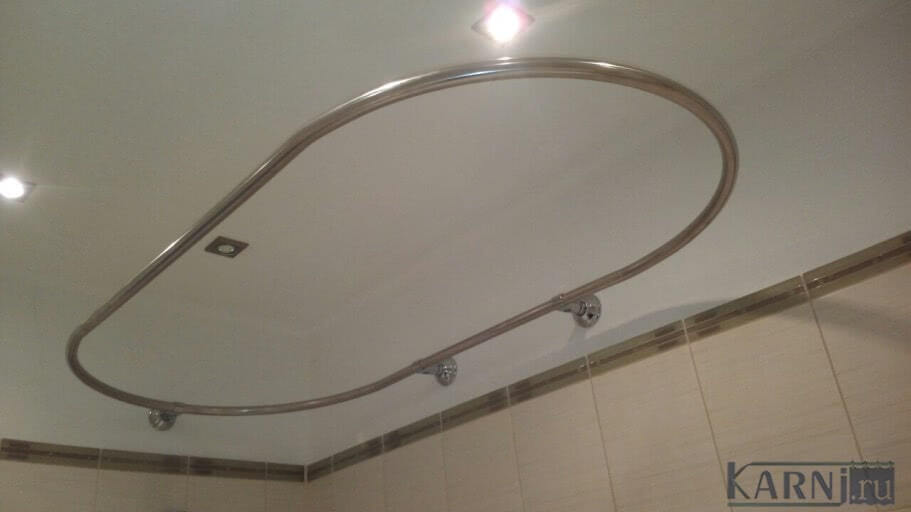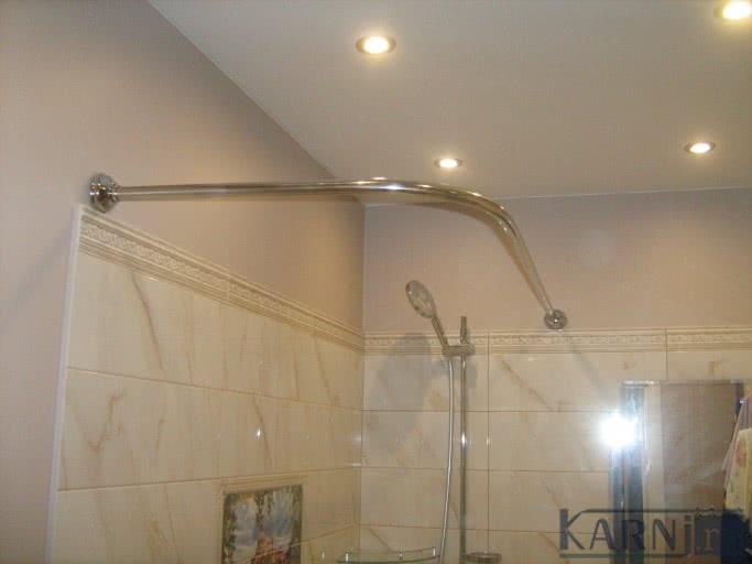 Такой подойдет для ванной комнаты с душем или угловой ванной или душевой кабиной. Изготовлены они из стали разных типов, в том числе хромированной и легированной. Внешне карниз – это полая труба, которая имеет разные варианты загиба. Крепить такой карниз можно на стену или стена-потолок. Преимуществом такого типа карниза является разнообразие форм выполнения. Карниз может быть П- или Г-образным, дугообразным, овальным, круглым.