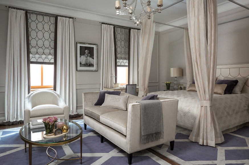 В этом случае на окнах не место коротким классическим занавескам до подоконника, рулонам и жалюзи. Полотна ткани должны полностью закрывать окно, свободно ниспадать на пол.
