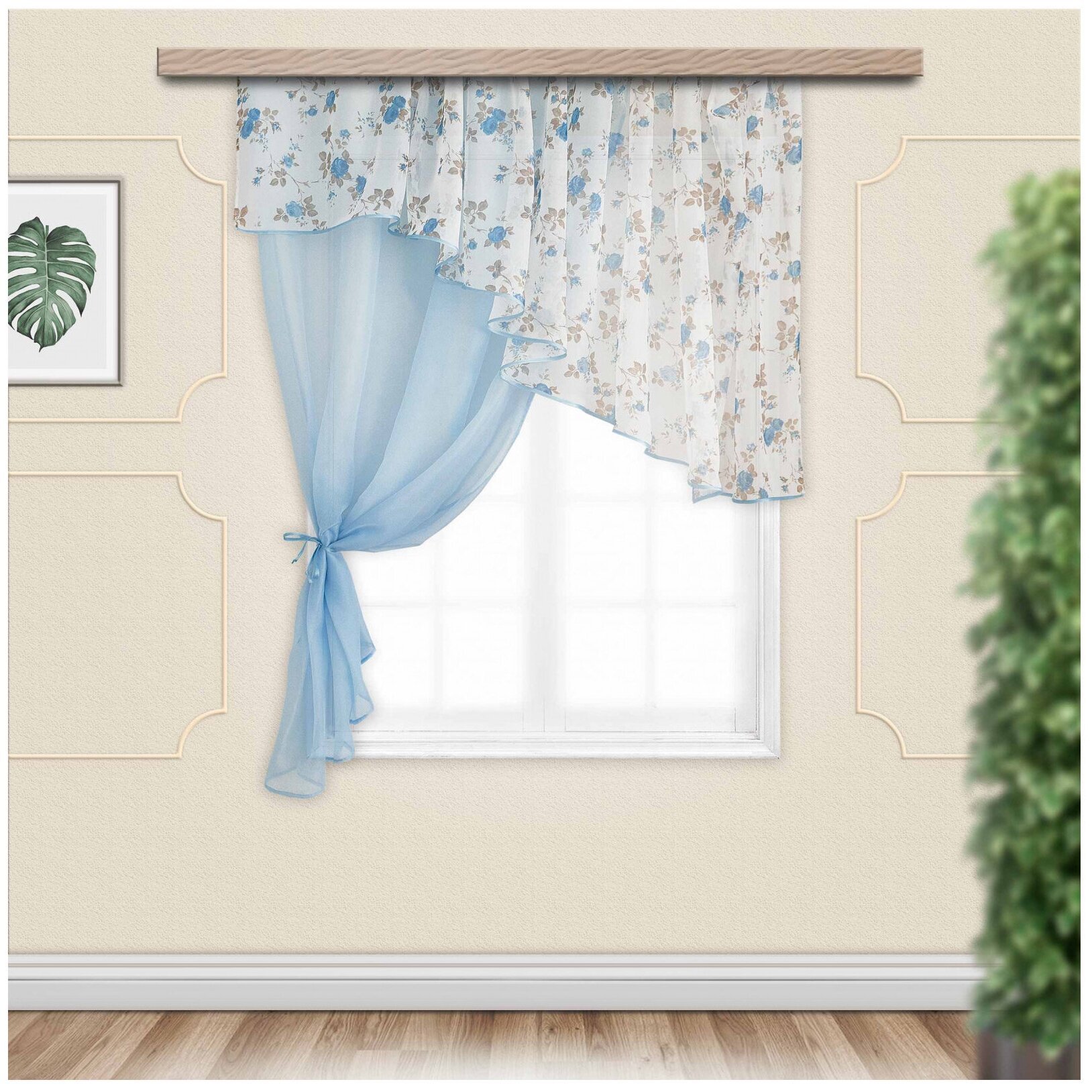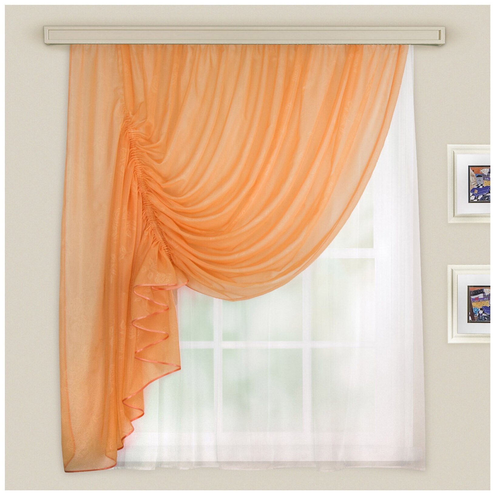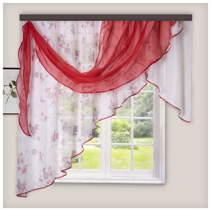 Она несет только декоративную функцию. Один ее край делают коротким, чаще всего длиной до подоконника, средняя часть перекидывается через карниз в виде ламбрекена, а второй край плавными эффектными складками опускается до пола. Для такой асимметрии чаще всего выбирают полупрозрачный цветные ткани: тюль, органзу, шифон, вуаль. Иногда для обеспечения светозащиты, их дополняют двумя обычными портьерами.