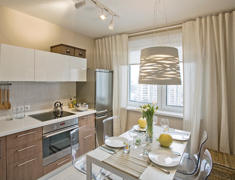 Беж на кухонных стенах будет делать помещение скучным. В данном случает рекомендуется использование занавески в яркой расцветке, только так, чтобы интерьер комнаты выглядел законченным.