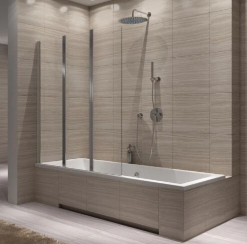 - Складные. Эта конструкция выглядит и работает по принципу гармошки. Стеклянные складные шторки для ванной также замечательно экономят площадь в небольшом помещении.
