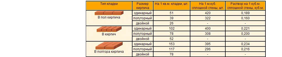 Таблица 1. Количество кирпичей в одном кубическом метре