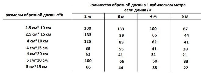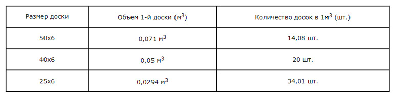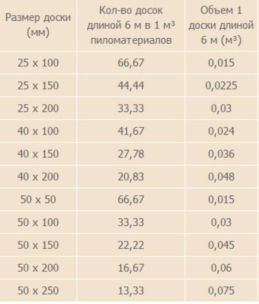| Размер досок | Количество досок в 1 кубе | Объем древесины в 1 доске, кубометров |