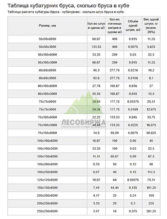 | Размер бруса | Количество бруса в 1 кубе | Объем древесины в 1 брусе, кубометров |