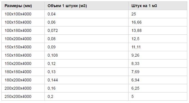 | Размер бруса | Объем 1-го штучки (м³) | Количество бруса в 1м³ (шт. ) |