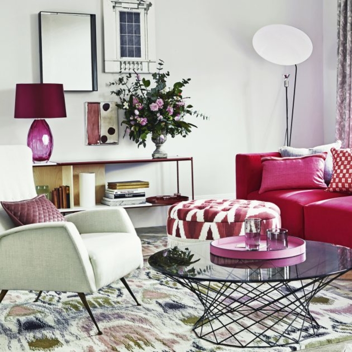 Вы знаете, даже такой теплый оттенок розового, как на первом фото, не очень любит соседство с красным цветом. Вообще сочетание относится к самодостаточным – оно интереснее выглядит без дополнительных ярких цветов. Белый – да, отличный акцентный цвет, а вот красный я бы не стала добавлять.