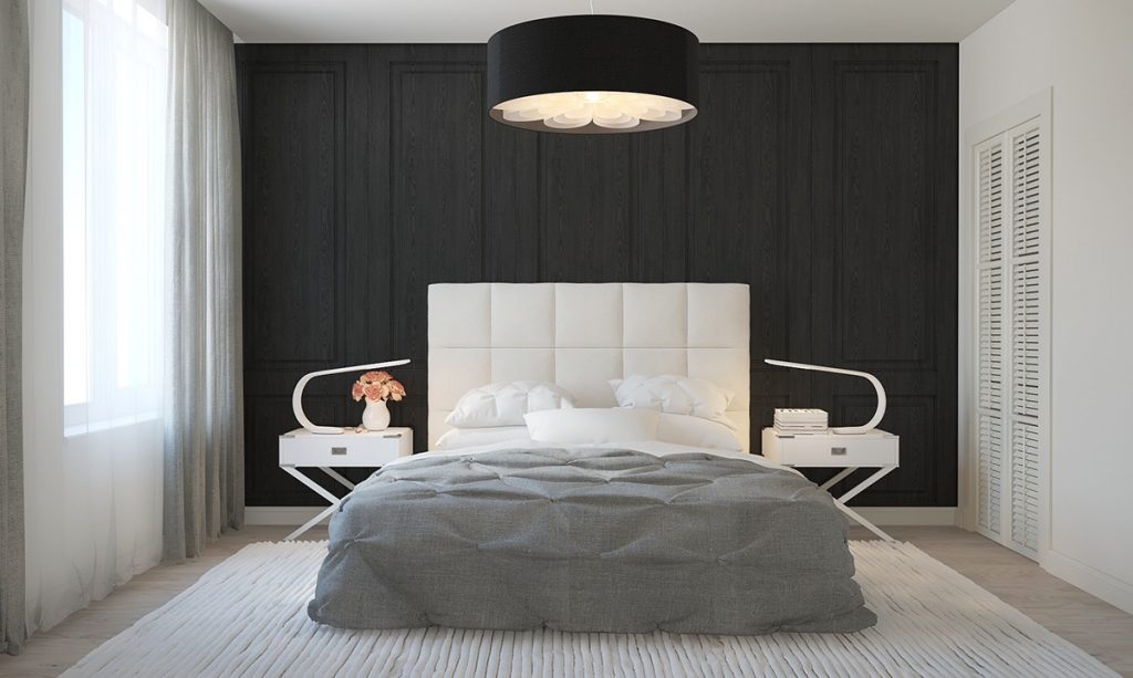 Обычно таким способом выделяется зона с кроватью. Самый стандартный, но не дешёвый вариант — стены под покраску, рассчитывайте на примерно $11 за метр.