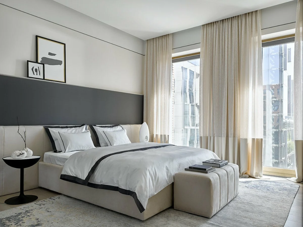 В этой спальне от Grey Space Interior Design угрюмая палитра черного, бежевого и хаки создает успокаивающую атмосферу, в то время как ограниченный декор и большое количество открытого пространства создают ощущение минимального пространства.