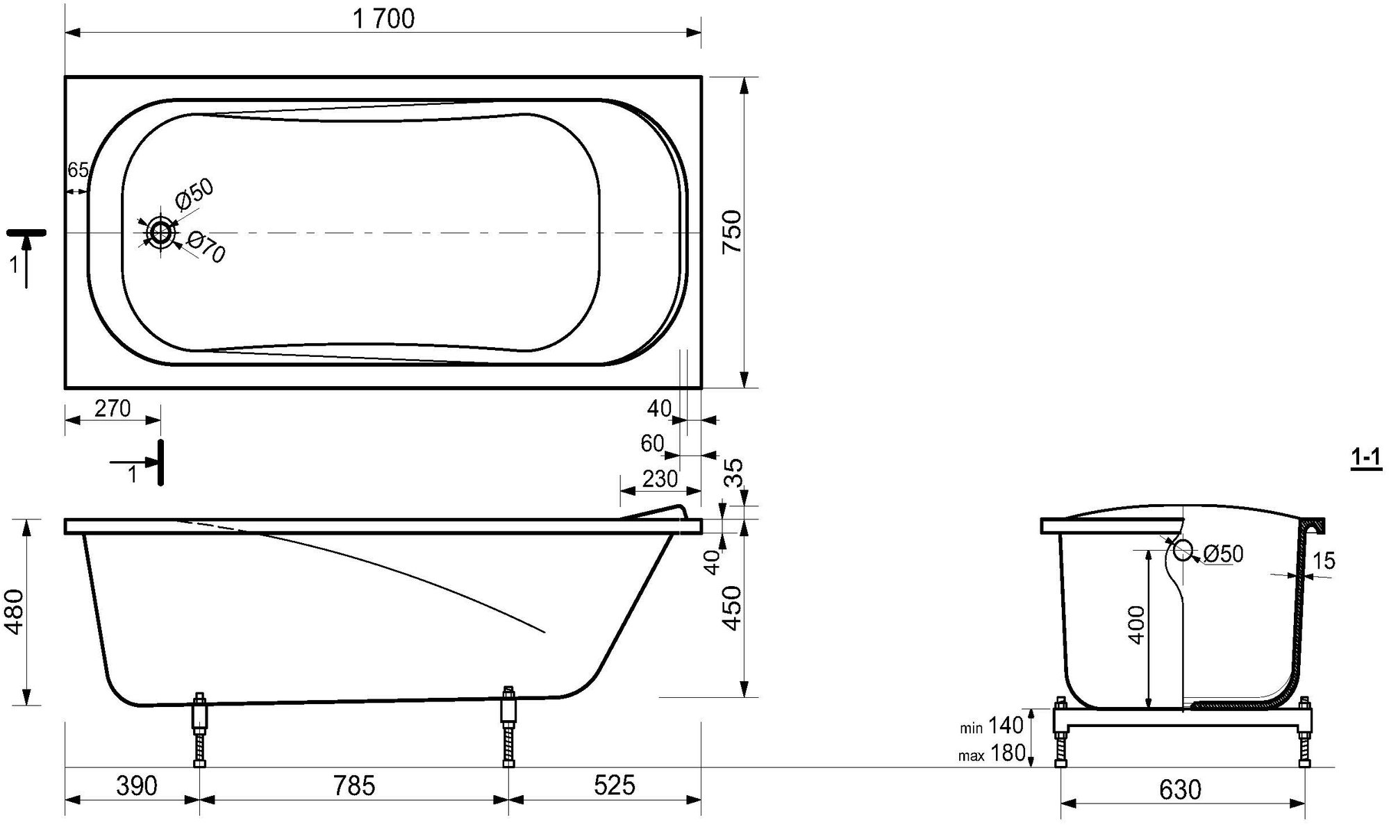 Модели этой категории имеют размеры 140х70 см и 150х70 см, наиболее удобные для использования. Они считаются максимально комфортными, а потом пользуются спросом.Стандартная ванна 150*70