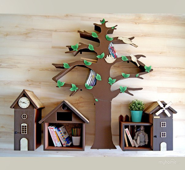 В том случае, если вы умеете работать с деревом, тогда можно сделать ступенчатые полки. Они, несомненно, влияют на вид комнаты, в которой они будут установлены. Они принесут необычную атмосферу в гостиную комнату. В детской ребенок может расфасовать книги по интересам, предметам, на некоторых ступенях установить предметы своего творчества.