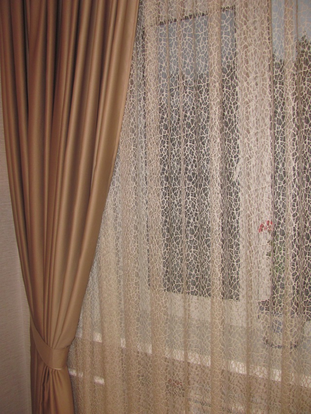 Тончайший тюль и непросматриваемые шторы, схожие по длине и по форме –проще простого. Тюль посередине, а с боков – шторы. Выглядит скромно и строго.