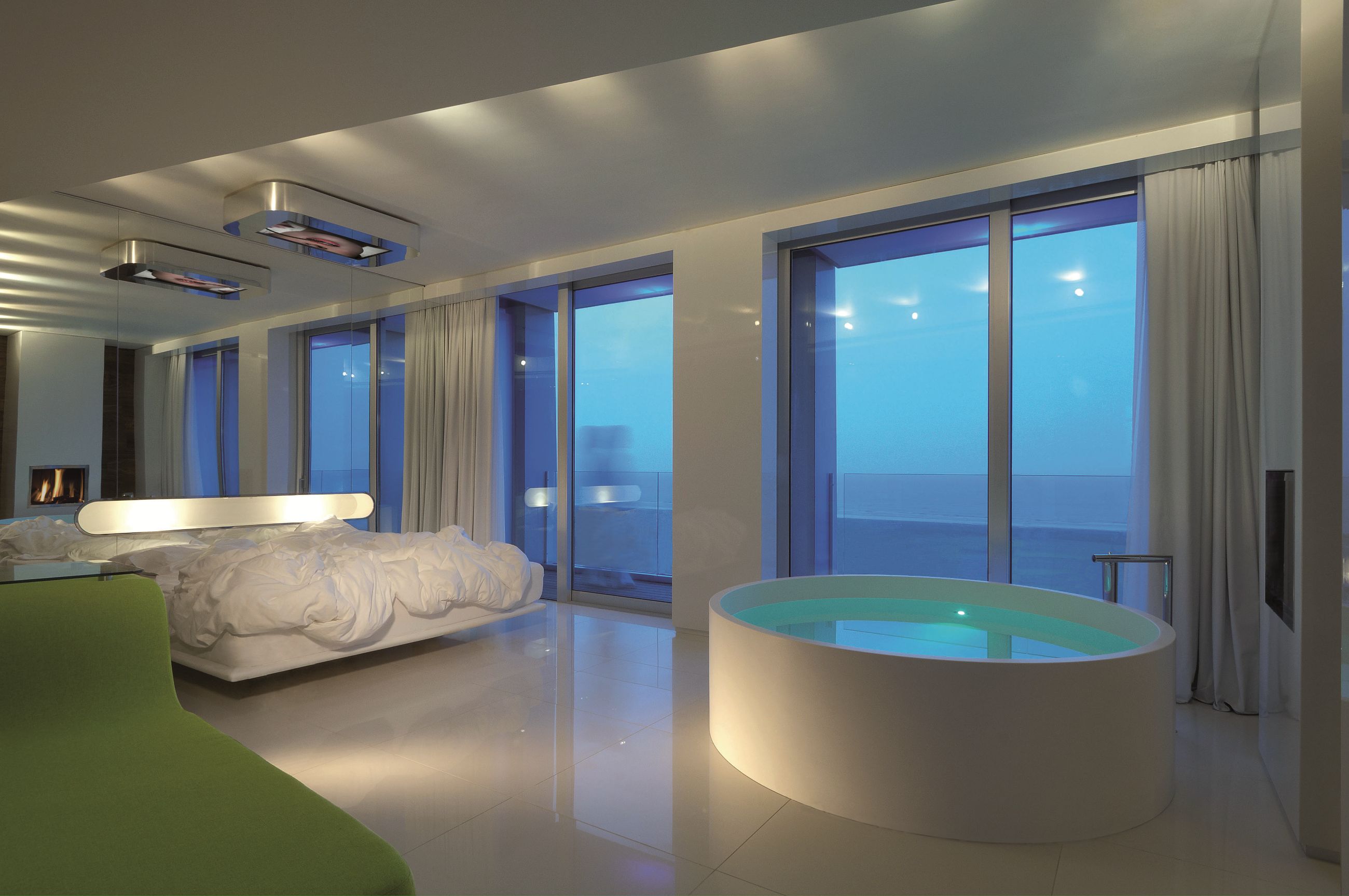Сантехника. Оригинальных предложений — масса: это может быть душ за стеклянной стеной или потолочный душ-дождь с потолка с музыкой и подсветкой, джакузи или круглая ванна в полу напротив кровати.