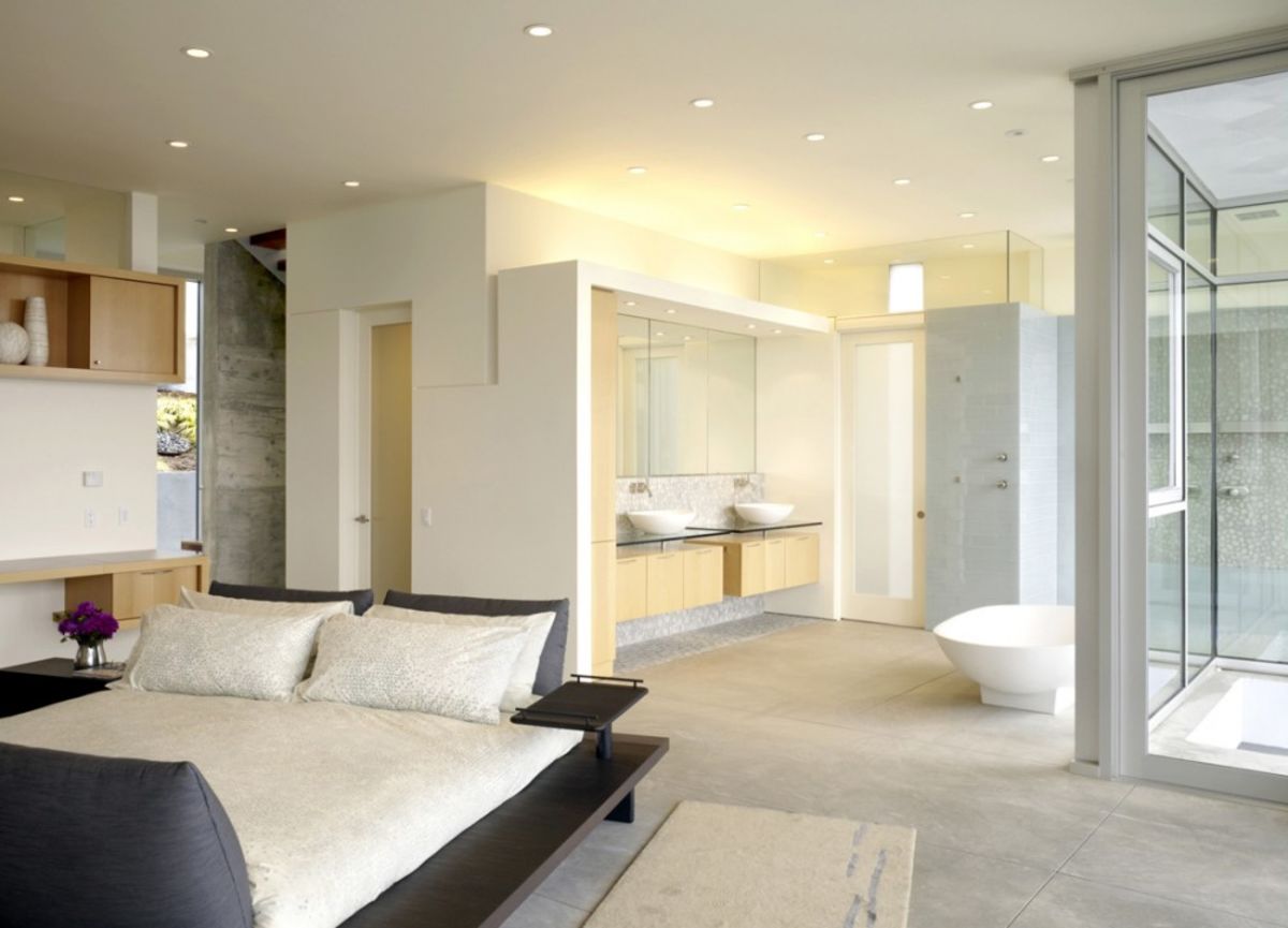 Заказчики все чаще обращаются к архитекторам и дизайнерам произвести планировку таким образом, чтобы ванная оказалась непосредственно в спальне.