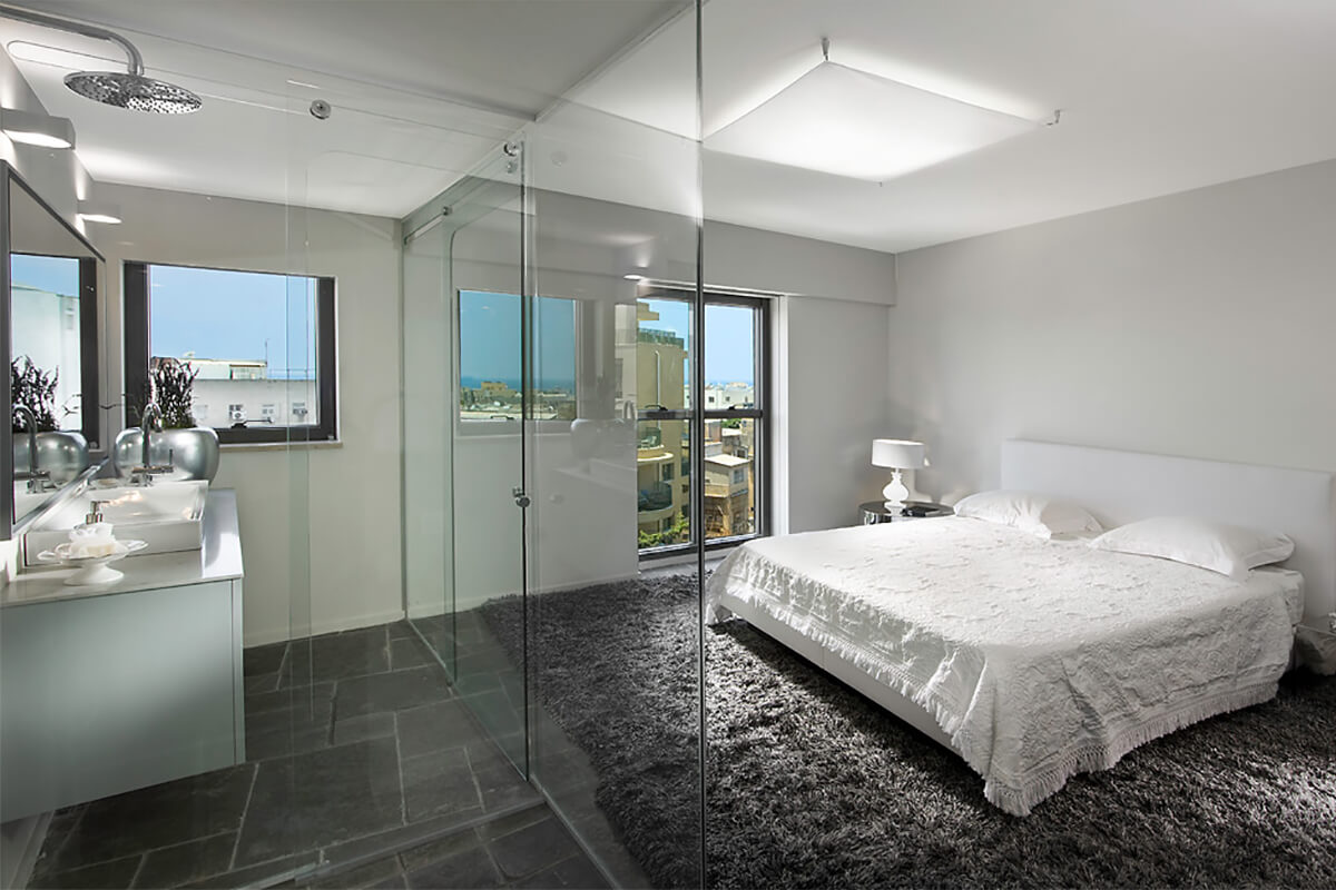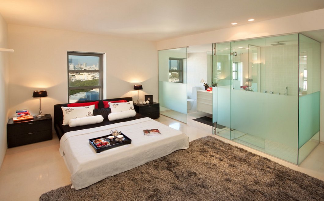 Спальня плавно переходящая в ванную интересное и комфортное решение, но относительно легко выполнимое только в частных владениях. Обитатели аппартаментов для осуществления такого варианта планировки должны решать массу инженерных и юридических вопросов.