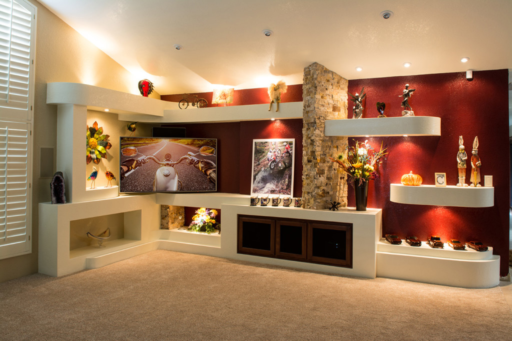 ΠΠΎΠ΄ΠΎΠ±Π½ΡΡ ΠΈΠ΄Π΅Ρ ΠΌΠΎΠΆΠ½ΠΎ Π½Π°Π·Π²Π°ΡΡ Π½Π°ΠΈΠ±ΠΎΠ»Π΅Π΅ ΡΠ°ΡΠΏΡΠΎΡΡΡΠ°Π½ΡΠ½Π½ΡΠΌ Π²Π°ΡΠΈΠ°Π½ΡΠΎΠΌ, ΠΊΠΎΡΠΎΡΡΠΉ Π²ΡΡΡΠ΅ΡΠ°Π΅ΡΡΡ Π² ΠΈΠ½ΡΠ΅ΡΡΠ΅ΡΠ΅ ΡΠΎΠ²ΡΠ΅ΠΌΠ΅Π½Π½ΡΡ Π³ΠΎΡΡΠΈΠ½ΡΡ , ΠΏΠΎΡΠΊΠΎΠ»ΡΠΊΡ ΡΠ°ΠΊΠΎΠ΅ ΡΠ΅ΡΠ΅Π½ΠΈΠ΅ ΠΏΠΎΠ·Π²ΠΎΠ»ΡΠ΅Ρ Π½Π΅ Π·Π°Π³ΡΡΠΆΠ°ΡΡ ΠΏΠΎΠΌΠ΅ΡΠ΅Π½ΠΈΠ΅ Π±ΠΎΠ»ΡΡΠΈΠΌ ΠΊΠΎΠ»ΠΈΡΠ΅ΡΡΠ²ΠΎΠΌ ΠΌΠ΅Π±Π΅Π»ΠΈ. ΠΠΎΠΌΠΈΠΌΠΎ ΡΡΠΎΠ³ΠΎ, Π½ΠΈΡΠ° Ρ ΠΏΠΎΠ»ΠΊΠ°ΠΌΠΈ ΠΌΠΎΠΆΠ΅Ρ ΠΈΠΌΠ΅ΡΡ Π°Π±ΡΠΎΠ»ΡΡΠ½ΠΎ ΡΠ°Π·Π½ΡΠ΅ ΡΠ°Π·ΠΌΠ΅ΡΡ, Π³Π»ΡΠ±ΠΈΠ½Ρ ΠΈ ΠΊΠΎΠ»ΠΈΡΠ΅ΡΡΠ²ΠΎ ΡΠ°ΠΌΠΈΡ ΠΏΠΎΠ»ΠΎΡΠ΅ΠΊ. ΠΡΠΎΠ±Π΅Π½Π½ΠΎ ΡΠΈΠΊΠ°ΡΠ½ΠΎ ΡΠΌΠΎΡΡΠΈΡΡΡ ΡΠ°ΠΊΠ°Ρ ΠΊΠΎΠ½ΡΡΡΡΠΊΡΠΈΡ Ρ Π²ΠΌΠΎΠ½ΡΠΈΡΠΎΠ²Π°Π½Π½ΡΠΌΠΈ Π² Π²Π΅ΡΡ Π½Π΅ΠΉ ΡΠ°ΡΡΠΈ ΡΠ²Π΅ΡΠΈΠ»ΡΠ½ΠΈΠΊΠ°ΠΌΠΈ, ΠΏΠΎΡΠΎΠΊ ΡΠ²Π΅ΡΠ° ΠΊΠΎΡΠΎΡΡΡ ΠΈΡΠΏΠΎΠ»ΡΠ·ΡΠ΅ΡΡΡ Π΄Π»Ρ ΠΎΡΠ²Π΅ΡΠ΅Π½ΠΈΡ ΡΠΎΠ΄Π΅ΡΠΆΠΈΠΌΠΎΠ³ΠΎ Π½ΠΈΡΠΈ ΠΈ ΠΌΠΎΠΆΠ΅Ρ Π²ΡΠΏΠΎΠ»Π½ΡΡΡ ΡΠΎΠ»Ρ Π΄ΠΎΠΏΠΎΠ»Π½ΠΈΡΠ΅Π»ΡΠ½ΠΎΠ³ΠΎ ΠΈΡΡΠΎΡΠ½ΠΈΠΊΠ° ΠΎΡΠ²Π΅ΡΠ΅Π½ΠΈΡ Π΄Π»Ρ Π²ΡΠ΅ΠΉ Π³ΠΎΡΡΠΈΠ½ΠΎΠΉ.
