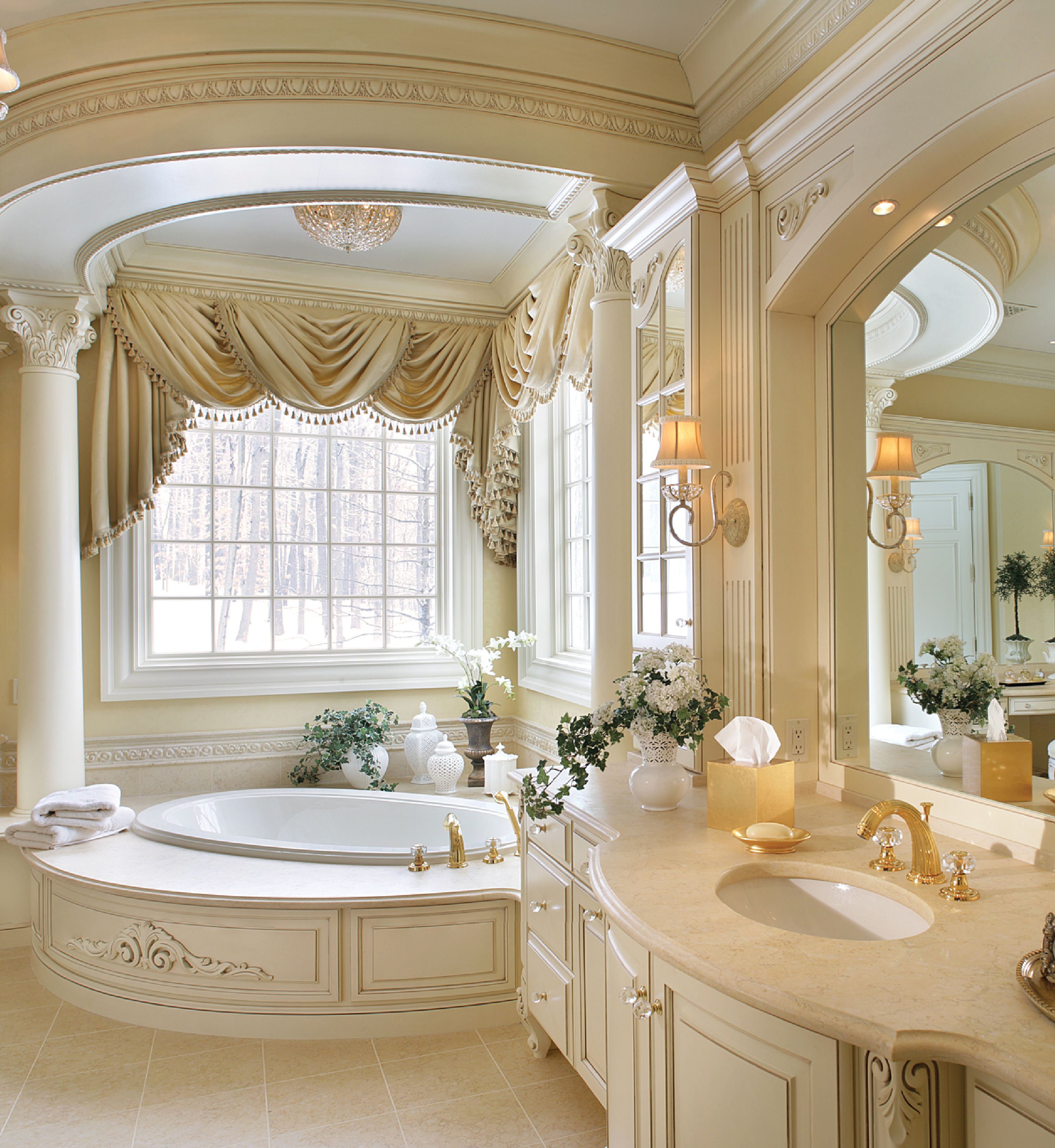 В классической ванной вы не встретите нарочито грубой отделки, кричащих оттенков, модерновых предметов декора или ультра-современных гаджетов и приспособлений. Вся обстановка подчинена общей концепции роскошного комфорта.