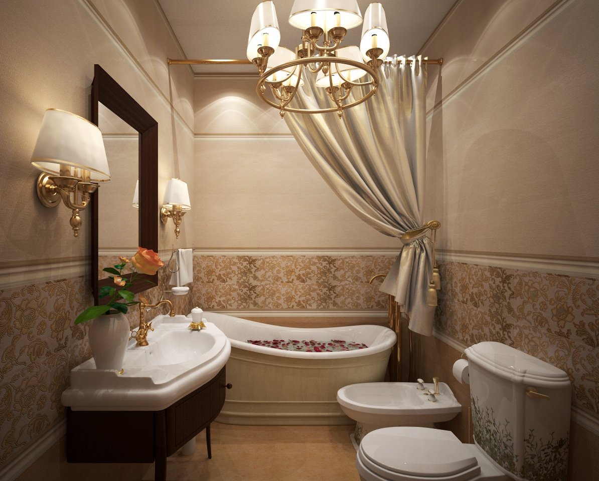 Для классического стиля в интерьере любых помещений характерно использование красивых люстр крупных размеров и ванные комнаты не стали исключением. Но, учитывая непростое комбинирование различных зон в рамках одного помещения, может возникнуть необходимость в дополнительном источнике света – встроенных светильников на потолке душевой кабины или настольной лампы на туалетном столике, настенных светильников возле раковины.