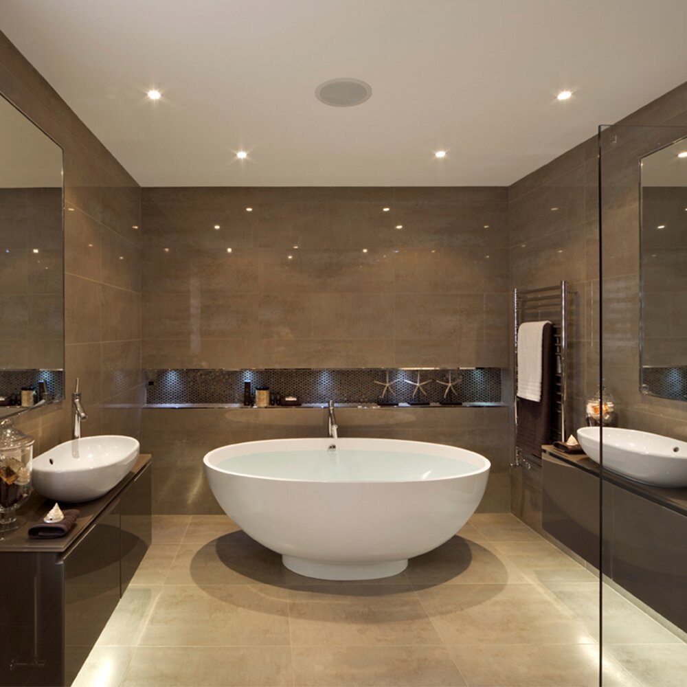 - Возможность обустройства точечного освещения. Для ванных комнат, так же как и для других в доме, актуальны разные сценарии освещения. И в качестве основного может быть именно точечный свет.