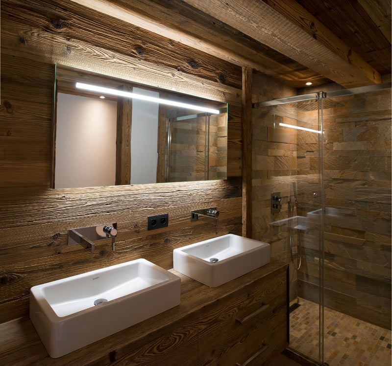 Вместо плитки или ковров для полов в ванных комнатах вы можете использовать дерево, чтобы придать им деревенский вид, что также является прекрасным зрелищем.