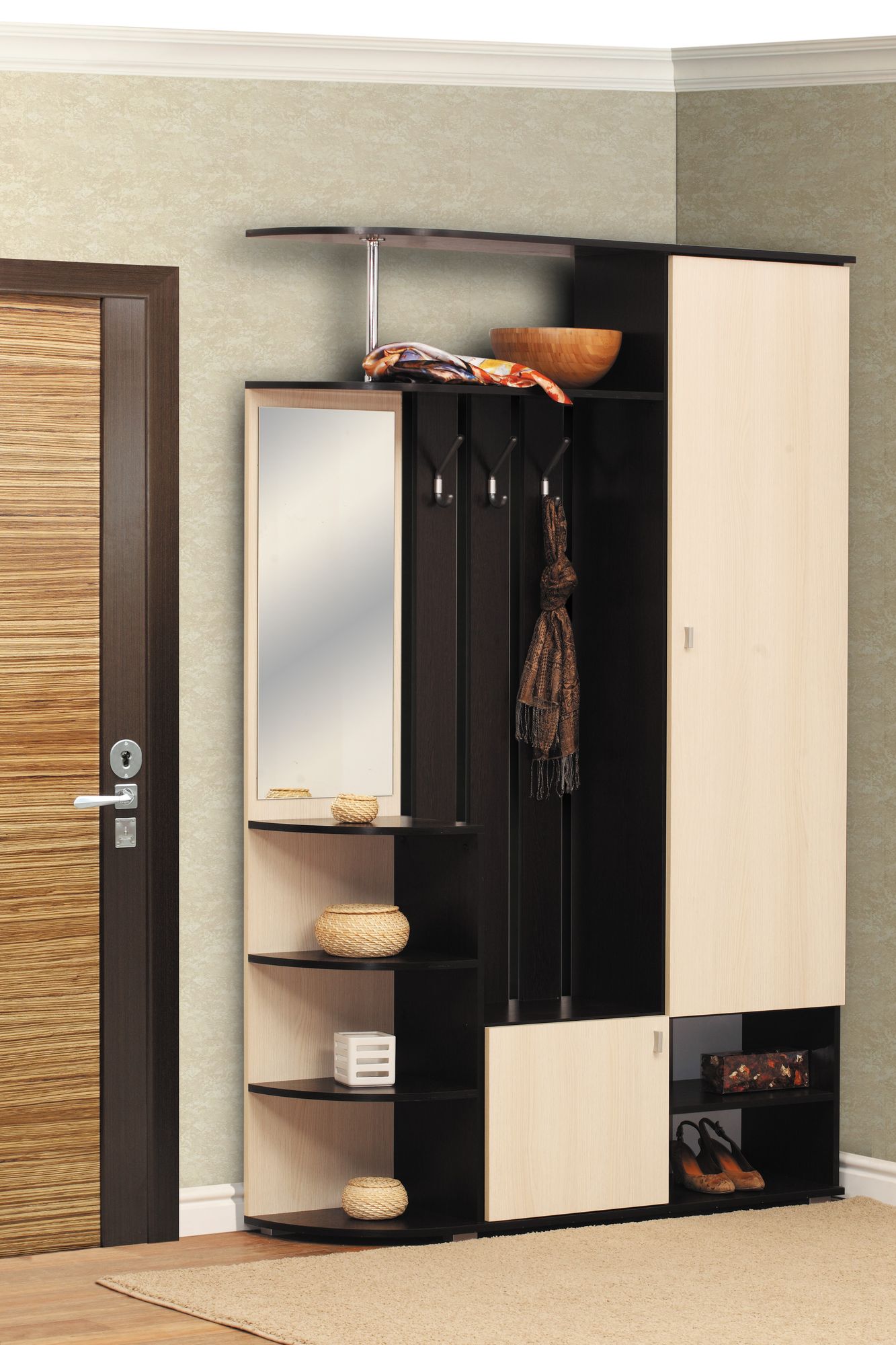 Если ваша прихожая совсем небольшая, отдайте предпочтение компактным настенным модулям, хаотично размещенным на одной из стен. Такое расположение позволит хранить достаточно много вещей. Перчатки, ключи и другие небольшие предметы можно расположить во вместительных выдвижных ящиках. Закрытые секции использовать для хранения обуви, а флакон духов и другие косметические средства разместить на верхней панели модуля. Здесь же можно поставить сумку.