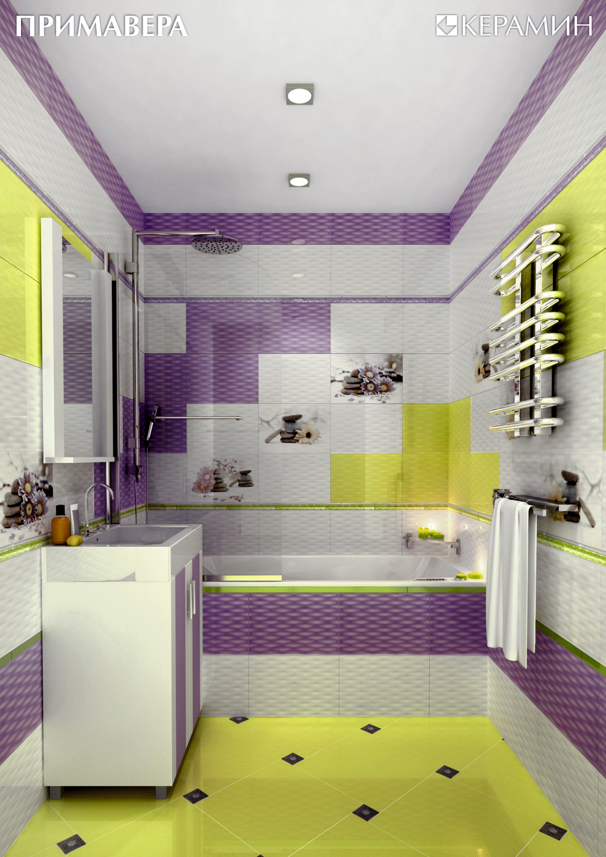 Салатовая с белым ванная комната, отделана одной из новинок плитки 2015 года.