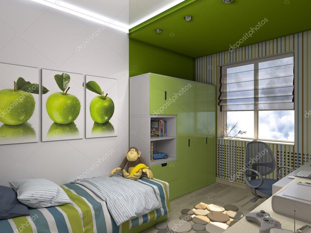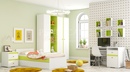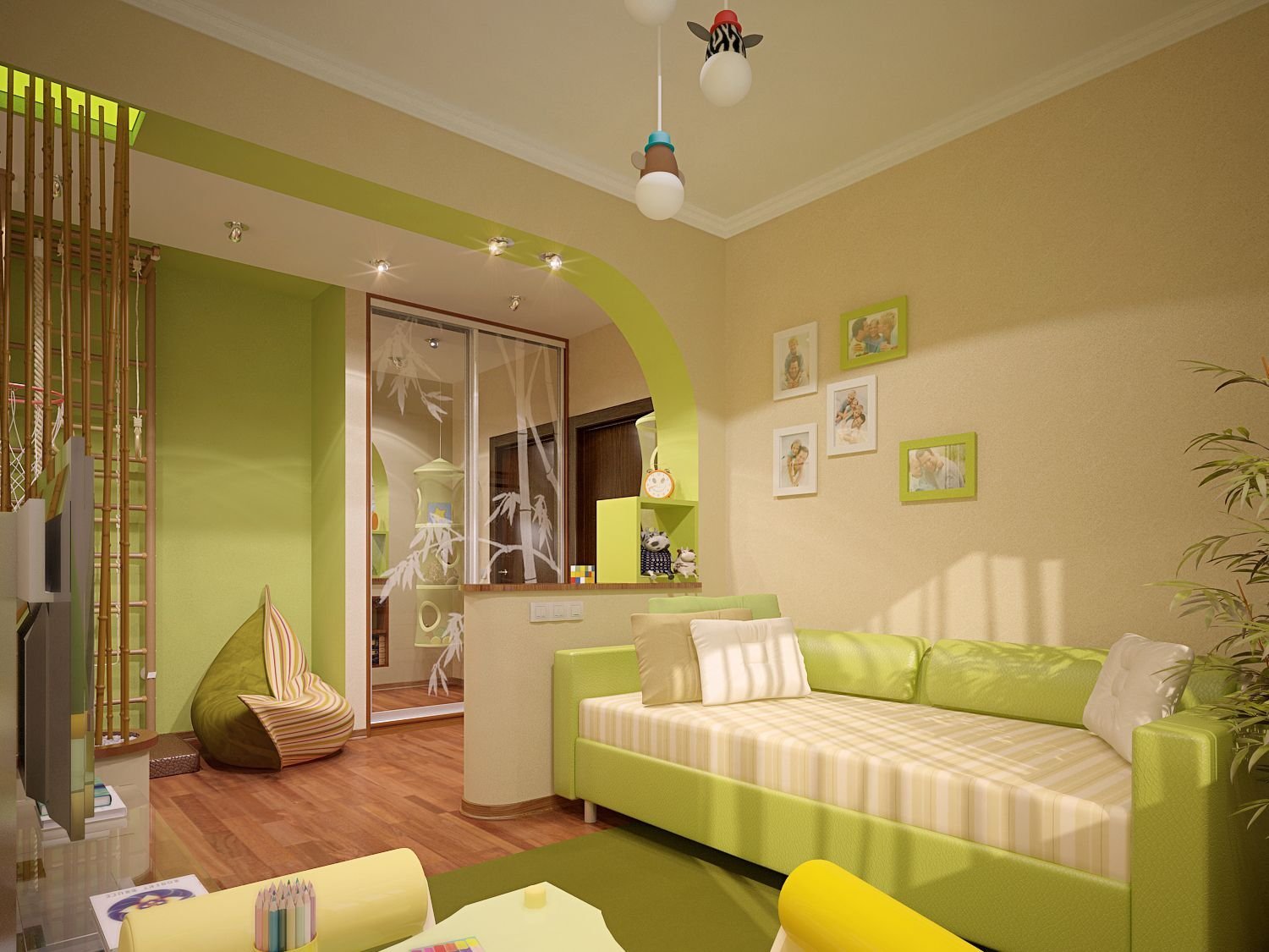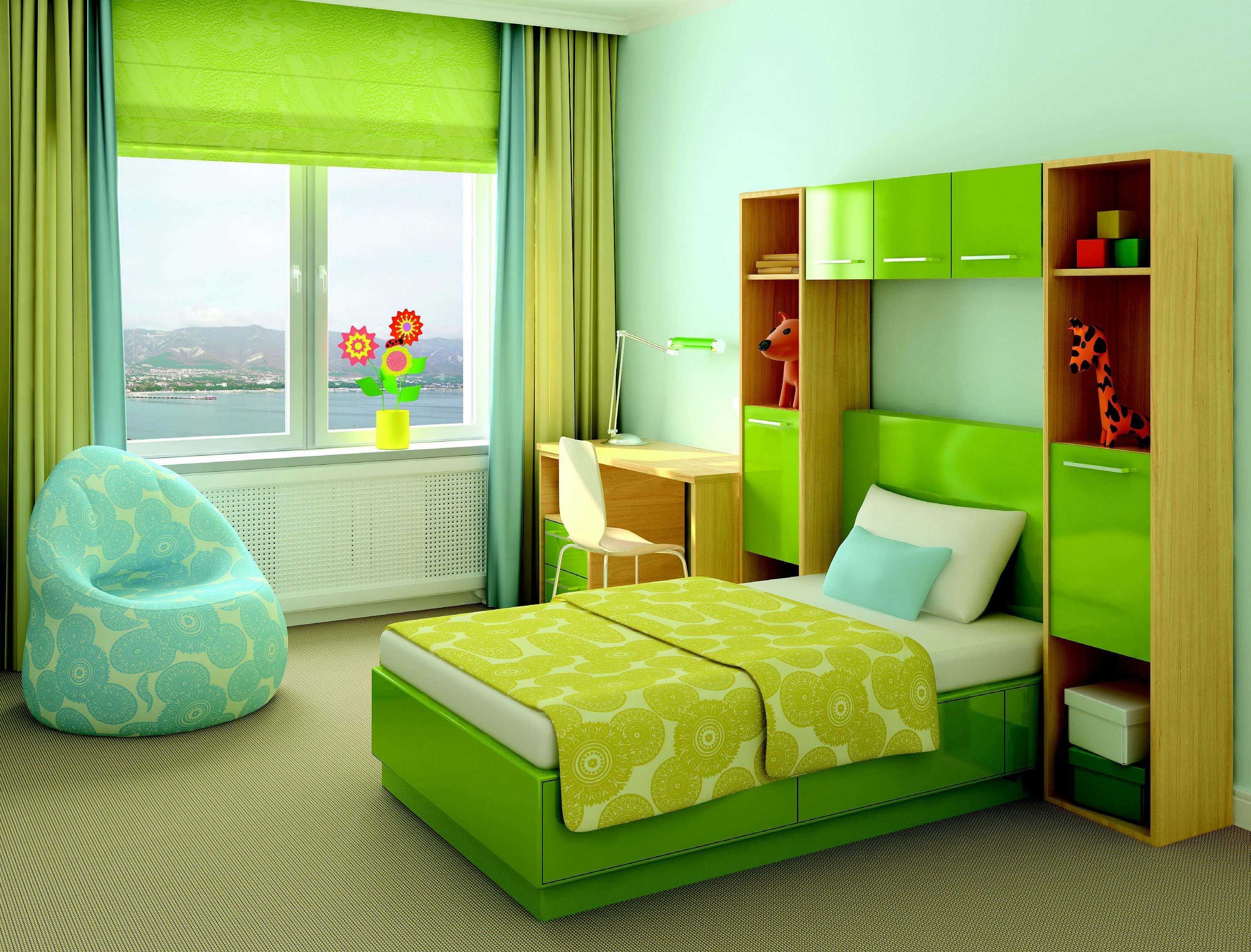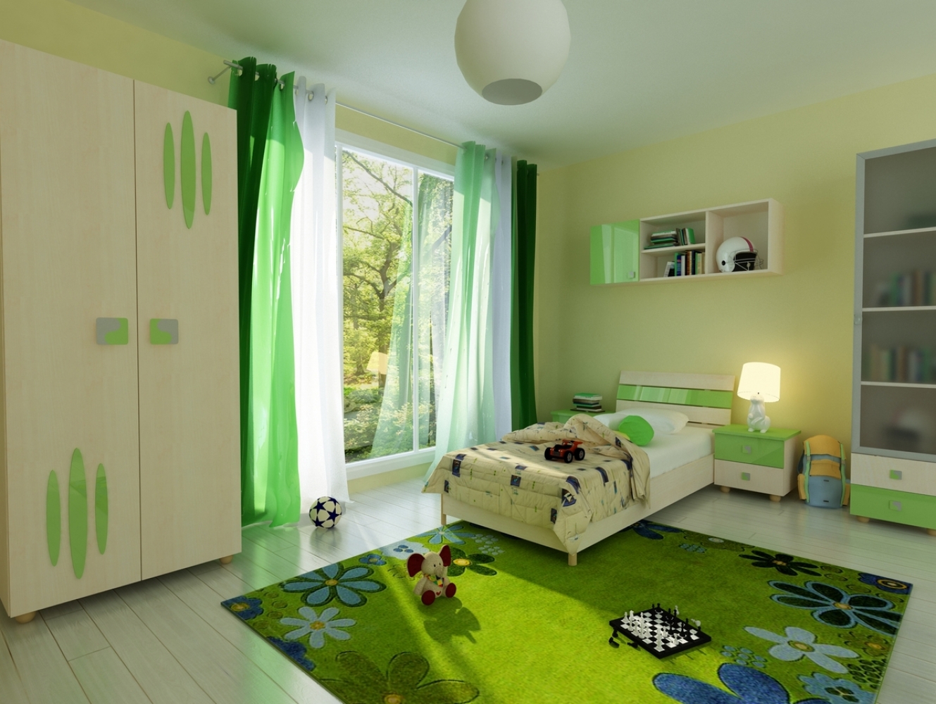 Зеленый цвет не имеет привязки к полу, он одинаково хорошо подходит для комнат мальчиков и девочек. Из мебели стоит выбирать мягкие кресла в светлых оттенках. Не лишним будет разбавить однотонный интерьер яркими подушками желтых, бирюзовых, голубых тонов.