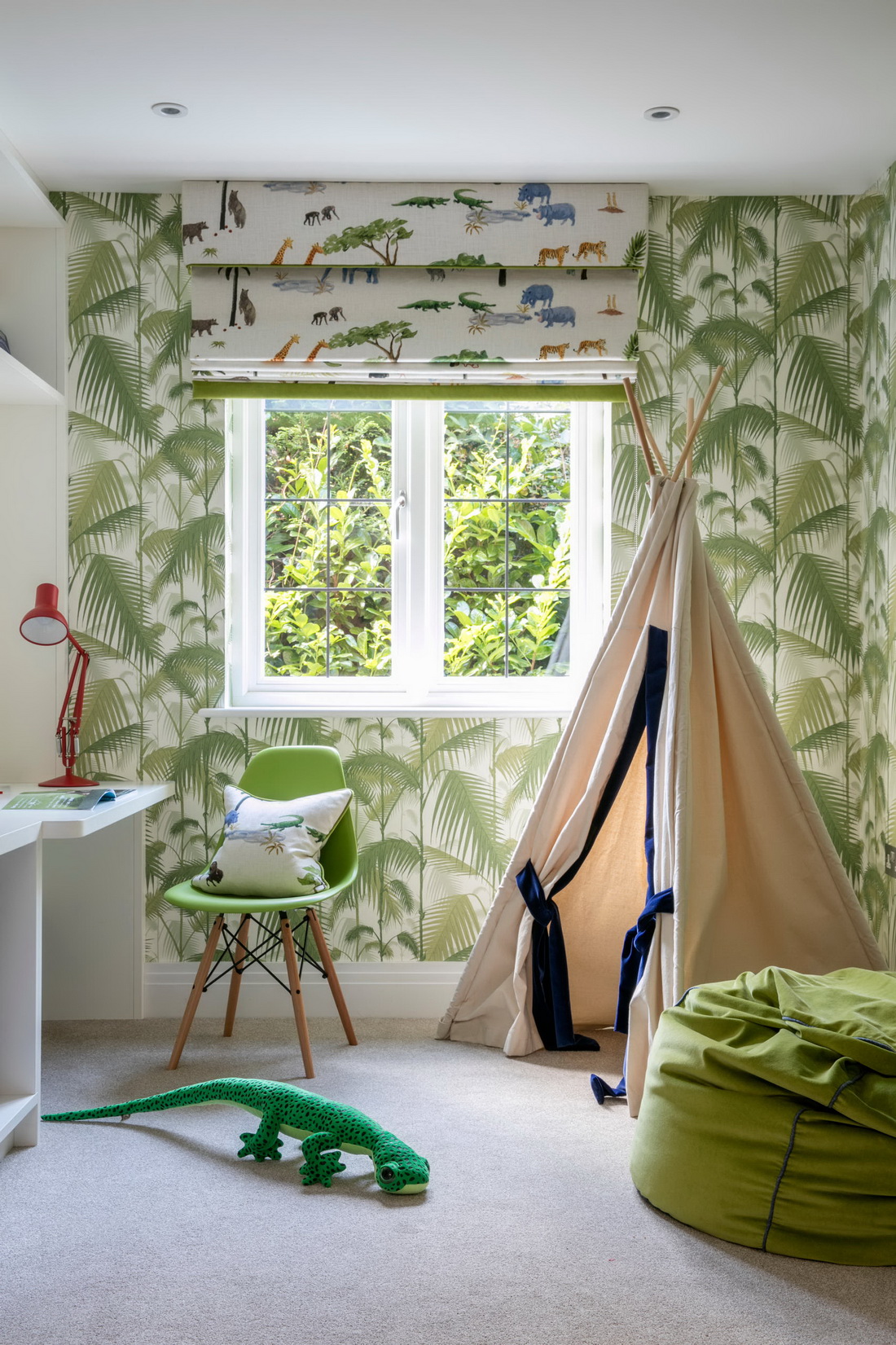 В детской комнате оттенки зеленого должны быть теплыми и солнечными. Выбирайте настенные покрытия, украшенные интересными узорами с изображениями милых зверушек, сказочных персонажей или простых цветочков. Обои в таком стиле очаруют вашего малыша.