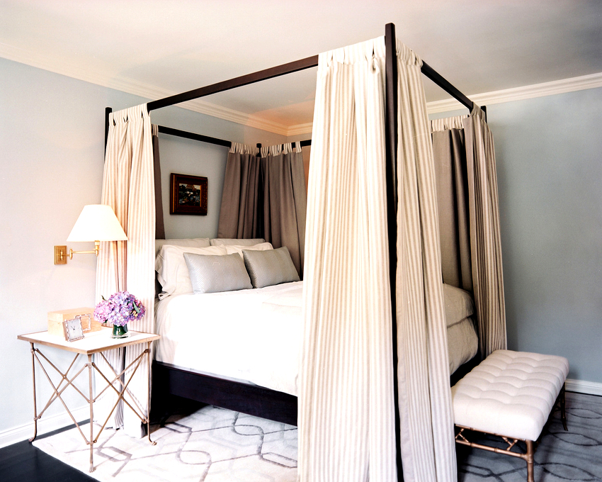 При оформлении спальни не останавливайтесь на идеях с занавесками для окон. В нейтральной комнате создайте визуальный интерес, включив слои, ткань и текстуру, как с этим драпированным балдахином, который образует фокус, не перегружая комнату.