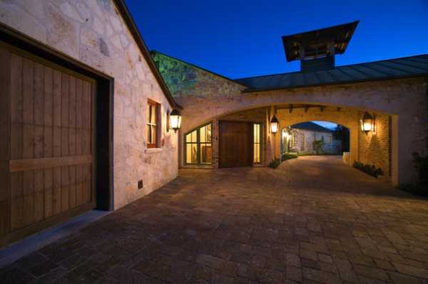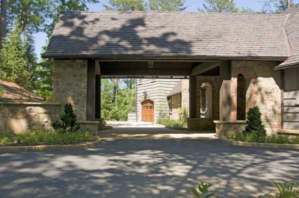 Этот вариант красиво обрамляет подъезд, элегантная каменная кладка, арочные проёмы и открытые стропила демонстрируют неповторимый французский шик старинных замков, адаптированный под современность.