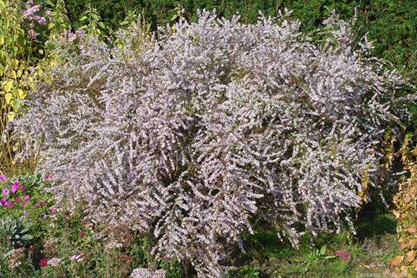 Для этого аккуратно вбивается колышек недалеко от основания куста и к нему привязывается куст. Благодаря густоте ветвей такую опору будет не видно. В период цветения, для того чтоб сохранить декоративность и ухоженность куста необходимо удалять засохшие соцветия.