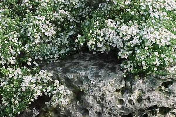 - Шнеекиссен. Невысокий шаровидный куст, вырастающий до 25 см, сильно ветвящийся. Его диаметр составляет около 0,6м. По сроку цветения этот вид относится к среднепоздним. Во время цветения куст покрывается соцветиями небольшого размера белой окраски с жёлтой серединкой.