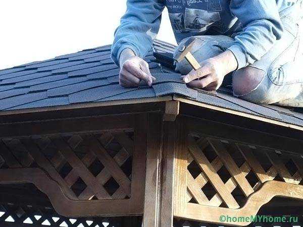 Крыша сооружается из брусков квадратного сечения диаметром 5 на 5 сантиметров. Для сборки каркаса обвязка устанавливается по периметру, стропильные ноги прикрепляются к ней. Далее набивается обрешетка беседки. Кровельный материал можно брать любой. Укрыть беседку садовую деревянную позволительно даже битумной черепицей. Настил получается весьма жестким, поэтому потребность в каркасе отпадает.