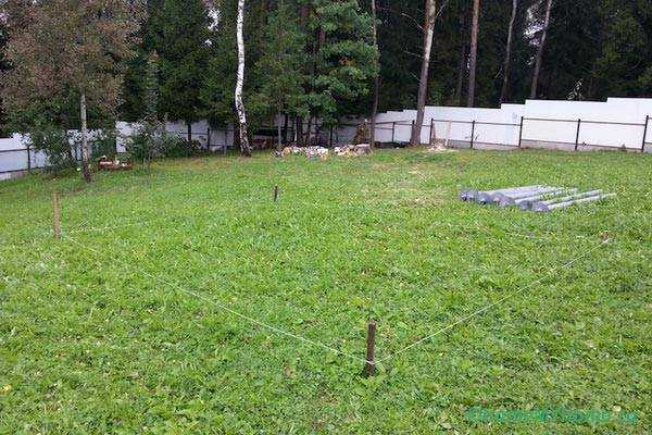 - Разметьте участок, где будет стоять беседка. Деревянные колышки вбиваются по углам, между ними натягивается шнур. Можно проверять диагональ.