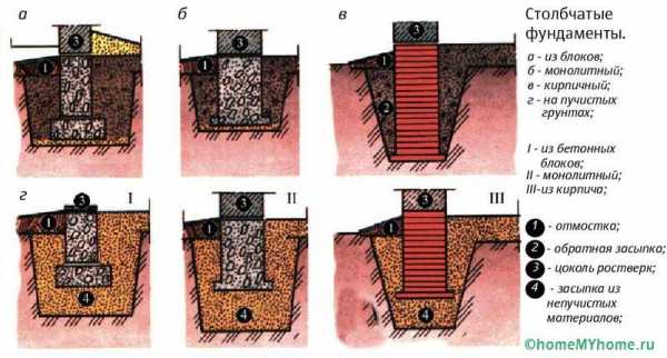 Схема устройства столбчатого фундамента в зависимости от типа грунта