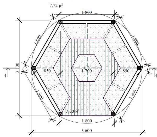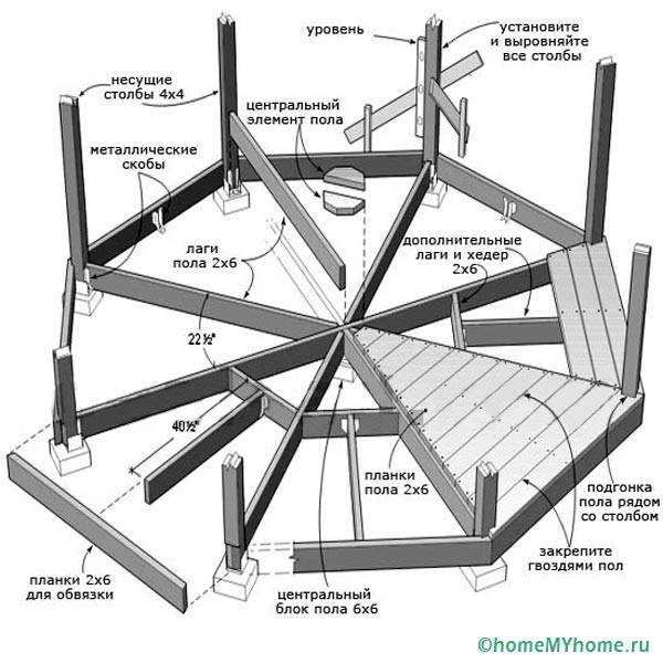Ниже представлен план строительства восьмиугольной беседки из дерева. Такая конструкция очень удобна тем, что внутри беседки будет комфортно и удобно: там с легкостью разместятся до 12-ти человек. Ее площадь может быть разной в зависимости от территории расположения и ваших желаний. Высота беседки – 2,5 метров.