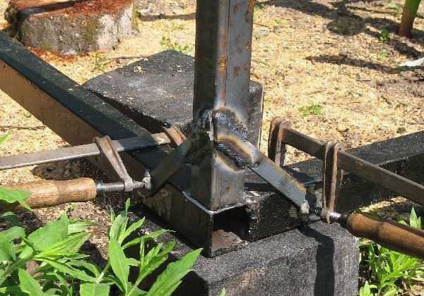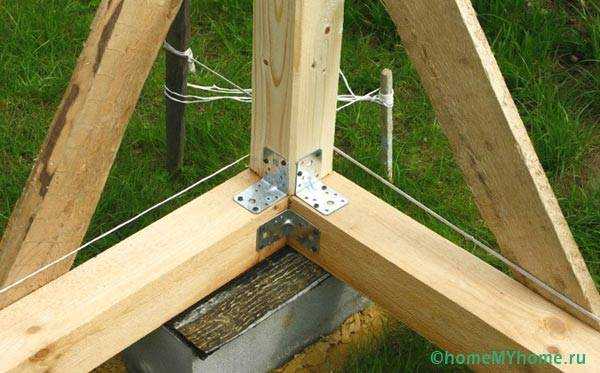 Крепление брусьев осуществляется с помощью металлических уголков.