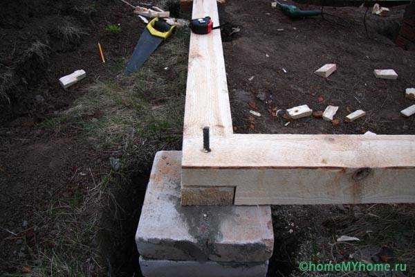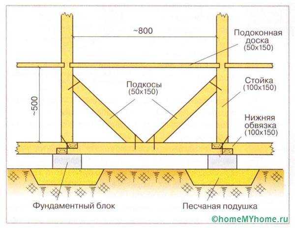 Второй способ подразумевает выставление деревянных стоек непосредственно на каждом столбе фундамента между перемычками основания.