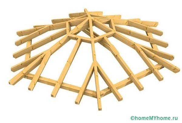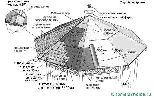 В точке пересечения диагоналей устанавливают вертикальный отрезок бруса, высотой 60-70 см, к верхушке которого набивают четыре диагональных стропила. Края балок выпускают на свесы длиной не менее 30-40 см. Полученный каркас всплошную зашивают необрезной доской или самым ровным горбылем. Остается уложить кровельное покрытие из стеклорубероида, после чего на диагональные стропила настилают Г-образные металлические планки, усиливающие крепление кровли.